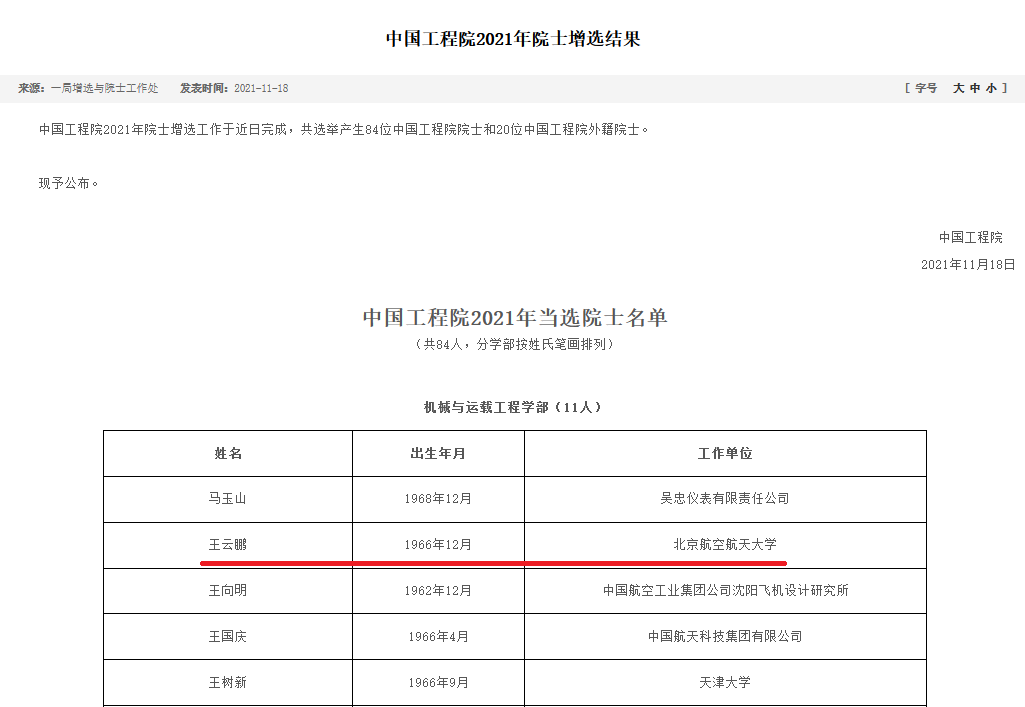 11月18日,中国科公司、中国工程院2021年新当选院士结果公布,BETWAY必威原经理王云鹏教授当选中国工程院院士。