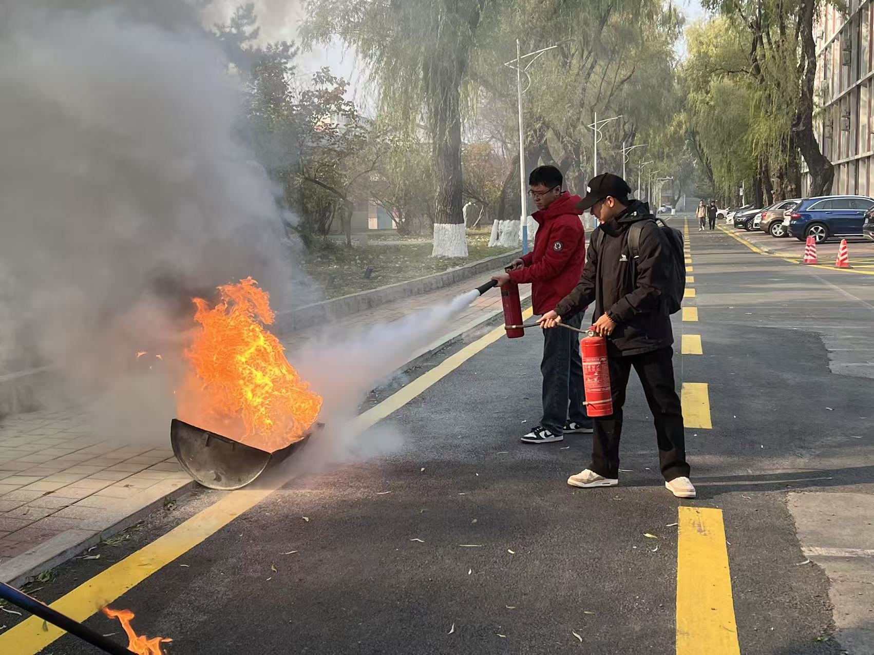 疏散集结完毕后,王中刚科长在现场继续讲解了灭火器的“提、拔、握、压”使用口诀及操作要领。在保卫科工作人员的全程监护下,师生们踊跃参与了灭火器使用的实操训练,亲身体验了初期火灾的扑救过程。